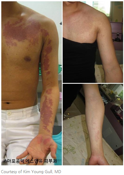 화염상모반은 성장에 비례하여 면적이 늘어나기 때문에 면적이 조금이라도 적은 어릴 때 치료를 시작하는 것이 경제적인 면에서도 유리합니다.