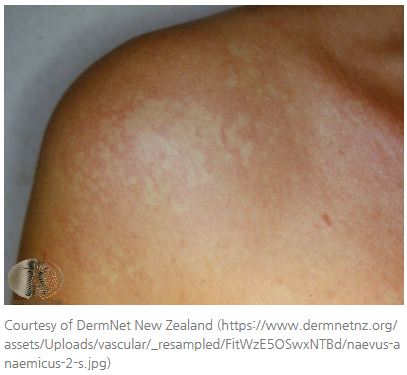 화염상모반과는 반대로 모세혈관이 감소해 창백해 보이는 것으로 빈혈모반 (nevus anemicus) 이라고 부릅니다.