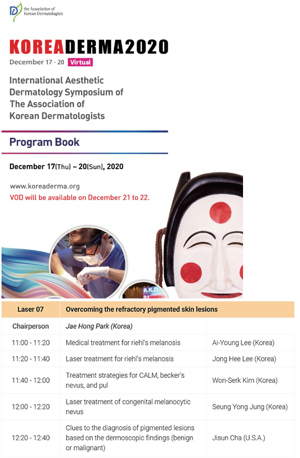 2020. 12. 19. 토요일정승용 원장은 온라인으로 열린 국제 피부과 학술대회인 에서 'Laser treatment of congenital melanocytic nevus' 란 제목으로 강연을 하였습니다.